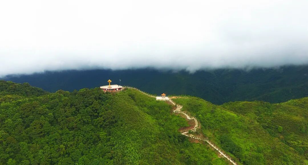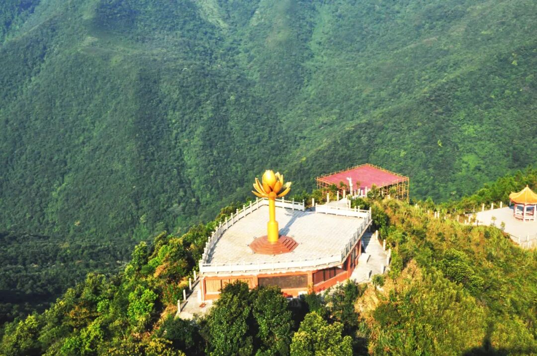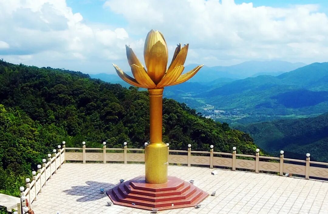 山顶矗立起了一尊金莲花雕塑在青山绿水的映衬下熠熠生辉