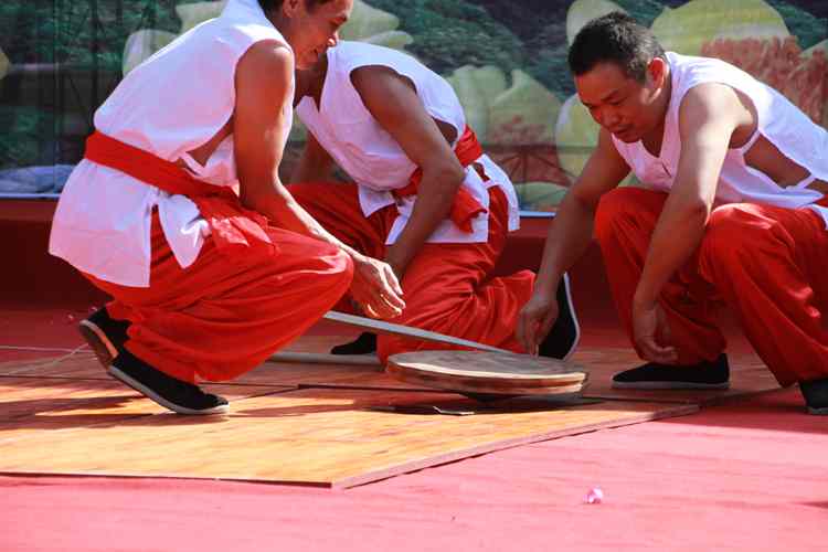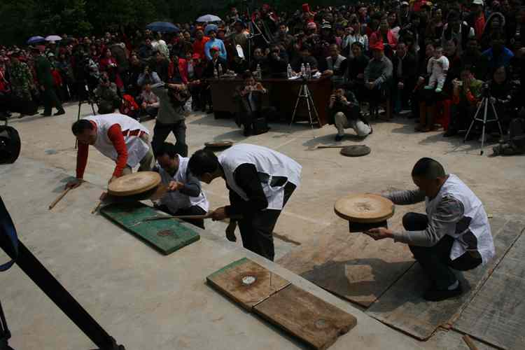 峒中砧板陀螺,一般采用坚度高、韧性好的优质红木制成,上平下尖,因形状、大小与砧板相似,故称砧板陀螺。其规格为30公分至40公分左右,陀螺周围中间有线槽,用来扎绳打陀螺之用。