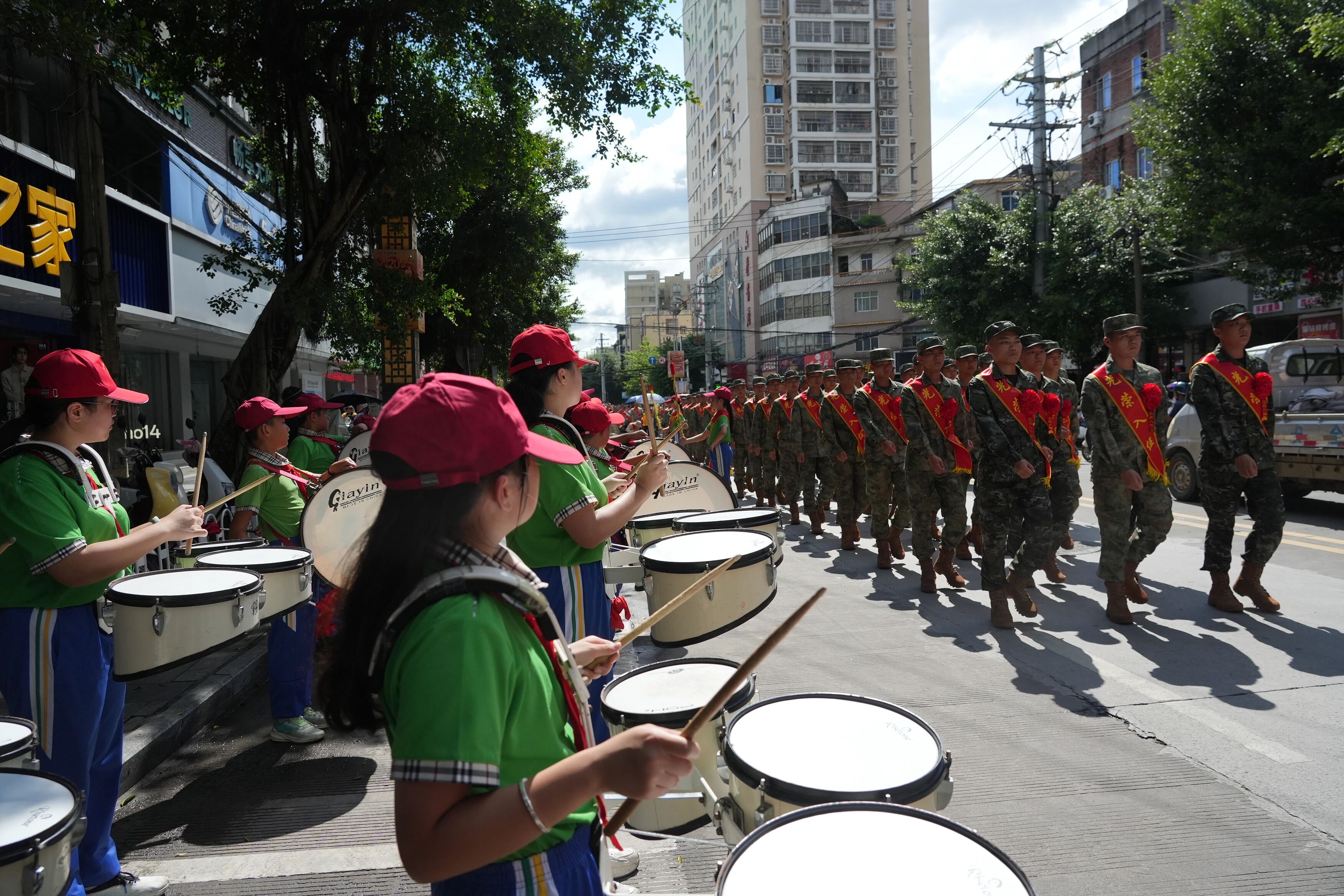 ▲沿线道路,防城区第二小学的鼓号队为新兵奏响鼓号。
